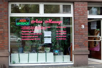 Chinesische Massageladen sind rot markiert, die Thai Massage Laden werden mit grünen Markierungen gekennzeichnet.
